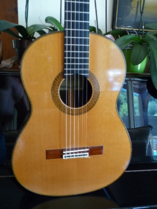 Ce qui signifie " j'aime travailler avec des bois doubles. Je fais d'excellentes réalisations en untilisant des bois durs à l'extérieur de la caisse ( Ebene de Macasar, palissandre du Brésil, Palo Serpiente.. etc ) et cyprès à l'intérieur (rouge ou blanc ). Je ne suis pas adepte de la double table qui permet de donner de la force aux sons qui deviennent impersonnels. Notre facon de faire permet d'avoir un aussi grand volume et de donner une personnalité à chaque guitare ....) Avec Antonio Marin Montero, et José Plazuelo Marin ils de Grenade un fief imposant de la lutherie espagnole.